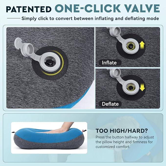 - ONE CLICK, ADVENTURE MADE SIMPLE - Simplify your camping setup with our sleeping bag pillow’s innovative one-click valve system, designed for effortless inflation and deflation. No more fumbling with complex mechanisms - adjust the compact travel pillow's firmness with a simple press of a button, and focus on what truly matters: enjoying the great outdoors. Efficiency meets convenience with our intuitive design!