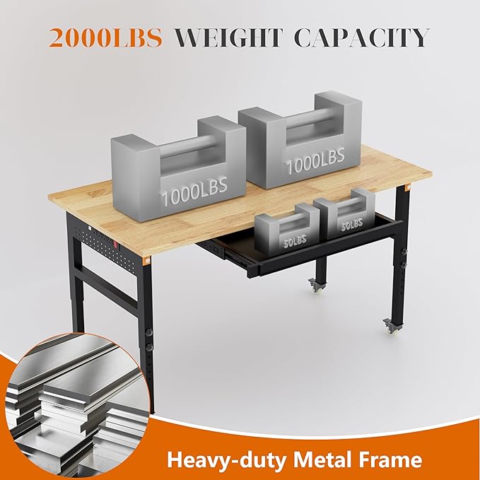 - Solid Wood & Reinforcing Rod: 60" x 24" solid rubber wood top with a sturdy metal frame. The weight load capacity of this heavy-duty workbench exceeds 2000 lbs. An extra support rod enhances horizontal stability, ensuring long-lasting performance