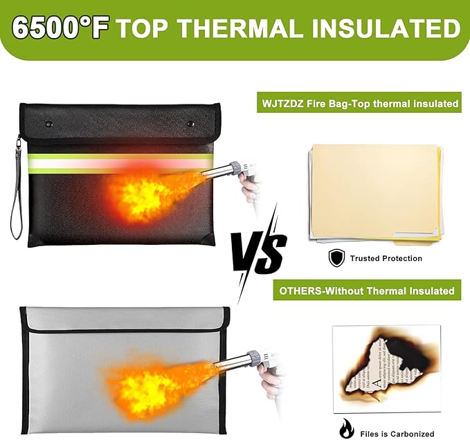 - ⚠️(Note) Fireproof does not mean it can withstand a long fire, and waterproof does not mean it can be immersed in water for a long time. It just gives you enough time to rescue your valuables. 🔥【6500°F Top Fireproof】The upgraded fireproof bag(11.2"x7.6") has passed the global flammability standard (US laboratory) and vertical burning test (SGS UL94 V-1) and can withstand temperatures up to 6500°F, far exceeding the typical fire temperature.