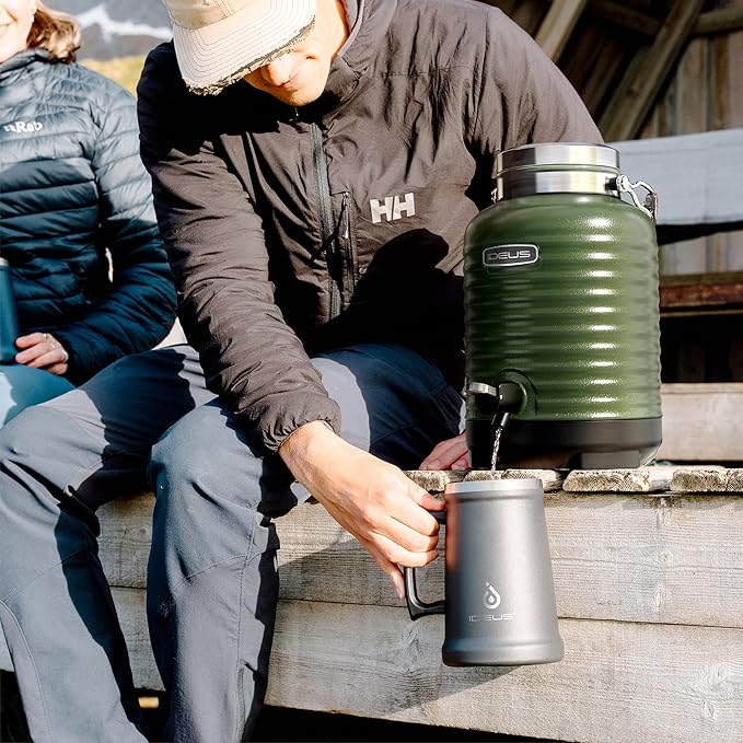 IDEUS Insulated Beverage Dispenser 5.2L, All-in-one for Camping Vacuum Double-Wall Stainless Steel Water Cooler Coffee Carafe Jug Leakproof Drink Container with Handle, Spigot & Stand (Green)