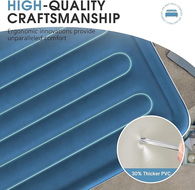 - Luxurious Flocked Top: Enjoy ultimate comfort with a soft flocked surface that feels plush against your skin, promoting restful sleep. Its easy-to-clean design keeps the air matress fresh and is ideal for families with children, indoors or outdoors