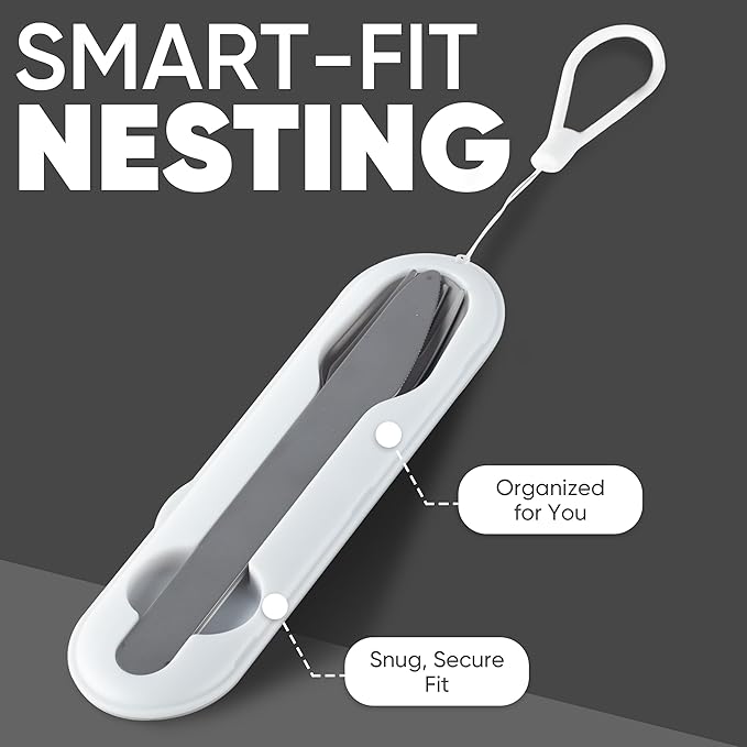 - COMPACT DESIGN AND LEAK PROOF CASE - Portable utensils with case fit in your pocket, purse, backpack, or lunchbox. “3 in 1” fork, spoon, and knife utensils stack and nest together for snug storage in leak-proof case that fits into your pocket