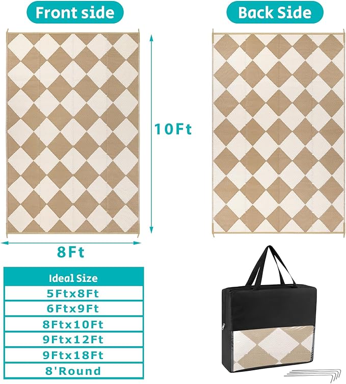- Versatile Outdoor Carpet: The indoor outdoor plastic rugs have multiple choice in different colors(4'x6',5'x8',6'x9',8'x10',9'x12',9'x18',8'round), is ideal for a variety of indoor outdoor activities,like patio mat, deck rug, garden rug, beach mat, picnic mat, BBQ party mat, rv camping rug,pool rug,outdoor doormat,garage rug,front door mat,allowing you to have plenty of imaginable space for more fun.