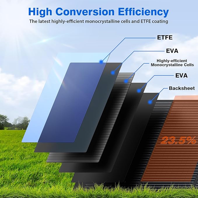- High Solar Conversion Efficiency Up To 24%!!! This portable solar panel uses the latest highly-efficient monocrystalline solar cells that convert the sunlight efficiently into clean energy with high conversion efficiency of up to 23.5%!