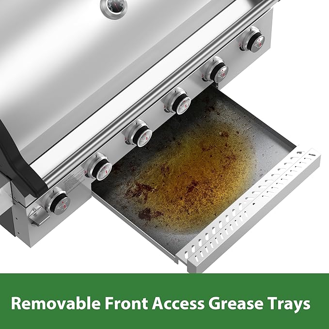 - No Mess: With our removable front grease trays, cleanup is a breeze. Simply slide them out to remove grease and drippings, keep your grill spotless and your cooking area neat, so you can focus on what matters most—enjoying delicious BBQ with family and friends