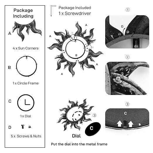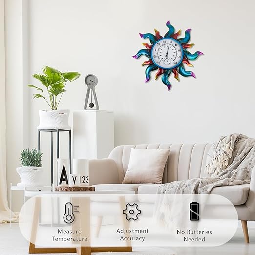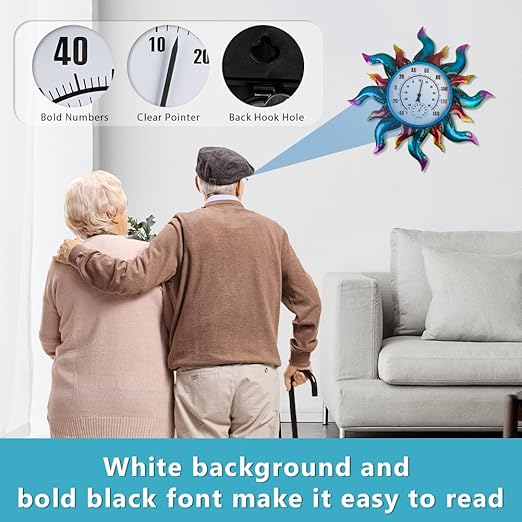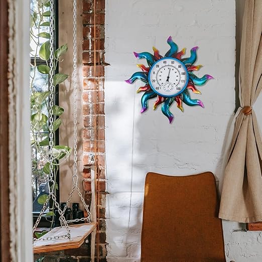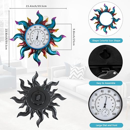 - Easy to Read: The multicolor sun shape and large black dial with large letters make this outdoor thermometer not only clear to read from a distance, but also a vintiage addition to the wall for indoor & outdoor. Measure about: 23.4" in diameter