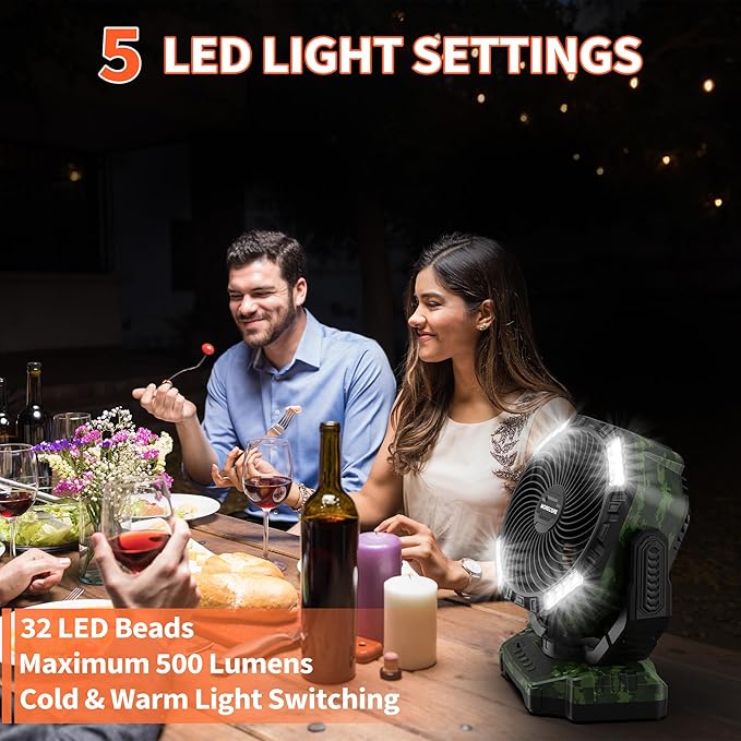 MORECORE 40000mAh Battery Operated Camping Fan with Light, 120HRS Running, Powerful 4 Speeds & Auto Oscillating, with Timer & Hook, for Travel Tent RV Emergency Hurricane Jobsite Garage-Camo Green