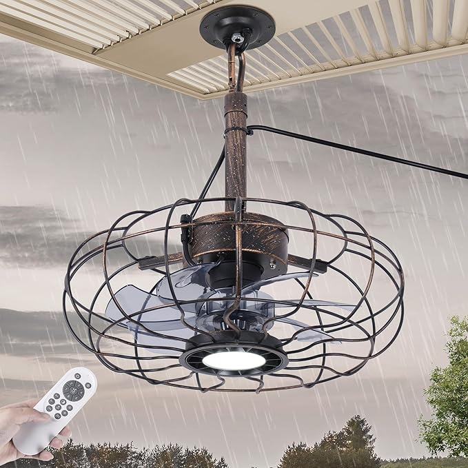 Outdoor Ceiling Fans with Light for Patios Gazebo, 15" Weatherproof Plug in Ceiling Fan, Gazebo Fan Remote, 3CCT Dimmable,Caged Ceiling Fan with Hanging Hook for Porch, Pergola,Canopy, Classical Black