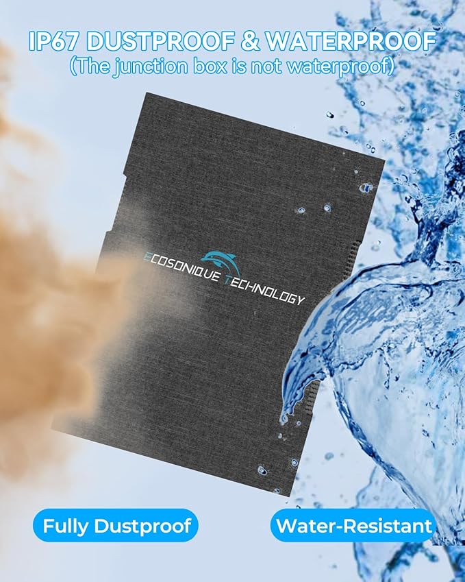 - Water-Resistant & Durable: Featuring high-quality ETFE laminate material with advanced lamination technology and a seamless, one-piece design, this solar panel offers 95% light transmittance. It protects the panel from harsh weather conditions, including rain, fog, snow, extreme cold, and heat. The durable materials and design extend the lifespan of the solar panel charger, making it perfect for outdoor use. (Note: The junction box is not waterproof.)