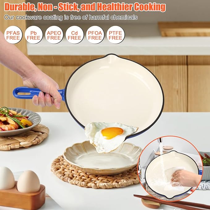 Nonstick Enameled Cast Iron Cookware Set, 7-Pcs Pots and Pans with Lid, Skillet, Frying Pan, Saucepan & Dutch Oven for All Stovetops, PFA Free - Ideal for Sourdough Bread Baking, Cobalt Blue