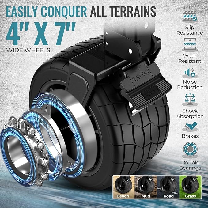 - EXTRA-WIDE WHEELS FOR SUPERIOR PERFORMANCE: Designed to stand out from other narrow-wheeled carts, the foldable wagon features four durable, 7" diameter, 4" wide, silent wheels. This larger, wider wheel design significantly enhances stability and maneuverability, allowing the wagon cart to easily tackle a variety of terrains. Whether it's sand, gravel, or uneven paths, our wagon outperforms other folding carts in any outdoor terrain