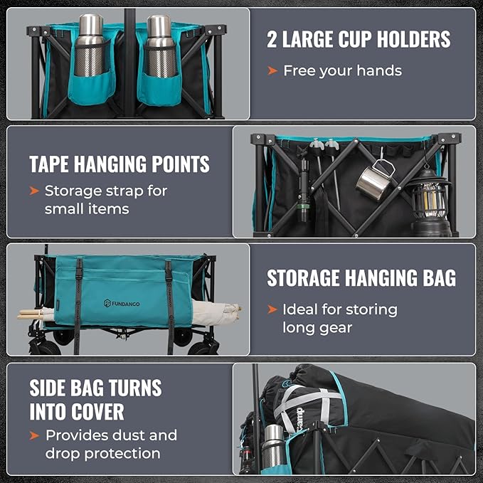 - EXTRAORDINARY STORAGE CAPACITY: FUNDANGO collapsible wagon has a maximum capacity of 300L, featuring a spacious and deep storage area measuring 39" L x 15" D. With 80% more room than most competing folding wagons, it provides unparalleled space to carry everything you need, making it the ideal choice for all your transporting needs