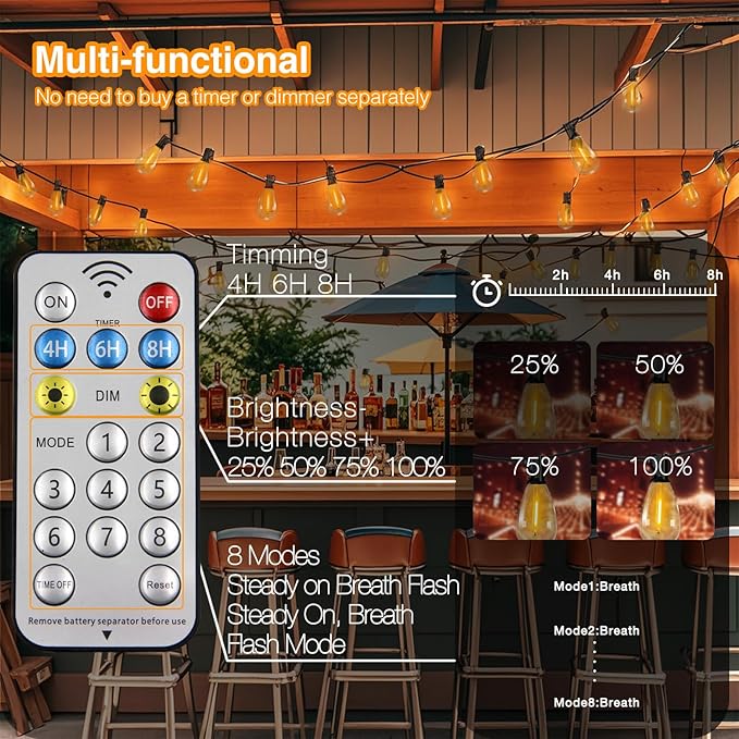 - These 120FT lights string are the perfect solution for bringing beautiful and functional lighting to your outdoor spaces. With the remote, you can easily turn the lights on and off, adjust the brightness levels, set the 6H/8H timer, or switch between different flashing modes