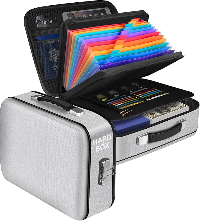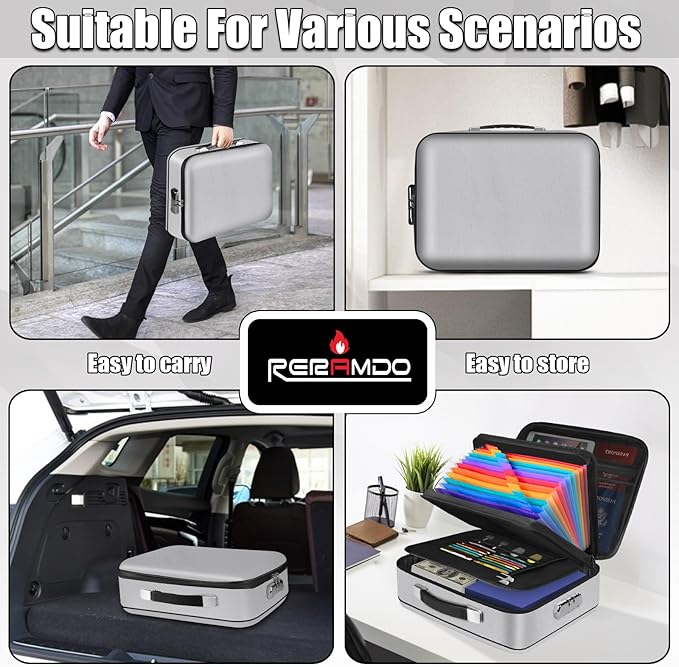 - 【Multiple safety details design】: Fireproof Document Box adopts mechanical password lock design, which can provide you with a safe storage solution. The zipper adopts water Resistant design to protect important documents to the greatest extent. The upgraded portable metal handle is lighter and more beautiful, making it easier to carry in an emergency, It also has two anti-skid pads at the bottom to improve stability and facilitate storage.Suitable for daily life, home office travel, and also very suitable as a gift for family and friends.