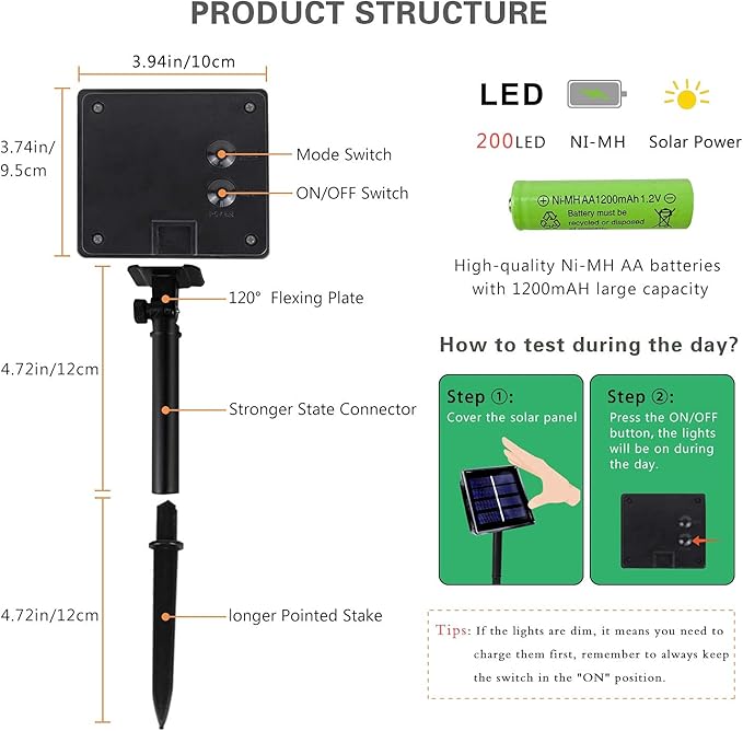 - 8 Lighting Modes, Memory Function and Auto On/Off: These solar twinkle lights have the On/Off button and mode button. You can select 8 different modes to satisfy your diverse needs by pressing the mode button.And the built-in memory chip saves your last modes setting, so there is no need to reset it again.