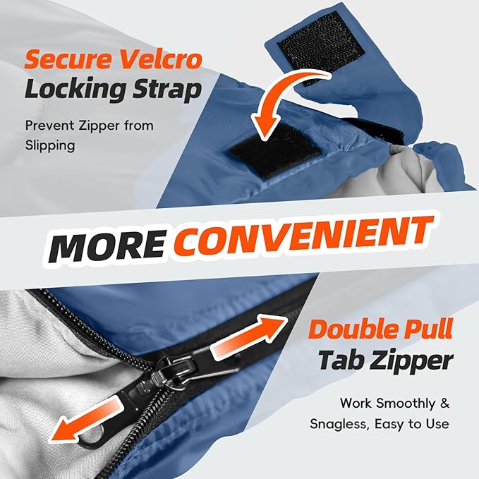 - EXCELLENT DESIGN : The double pull tab zipper on the right side makes it easy for you to open and close from inside or outside, work smoothly & snagless. The zipper at the bottom lets you ventilate the foot section for better temperature control. On warm nights, unzip it and use like a blanket