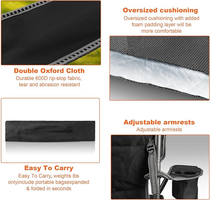 2 Pack Padded Oversized Camping Chairs for Adults,Heavy Duty Support 400 Lbs,Folding Portable Lawn Chair w/Cup Holder,Cooler Bag,Side Pocket,Perfect for Outdoor Picnic,Hiking(Black&Green)