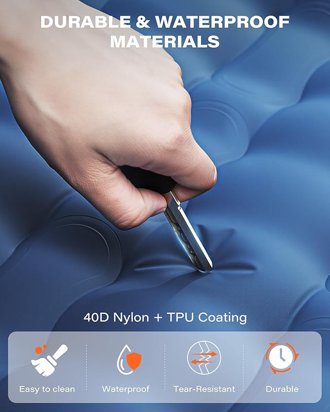 - 【Camping Grade Durable Material】: Camping mattress is built with tough 40D nylon and a TPU coating—tear-resistant, waterproof, and easy to clean. It supports up to 600 lbs, making it perfect for all body types. Heat-sealed edges prevent air leaks, even in rugged outdoor conditions.