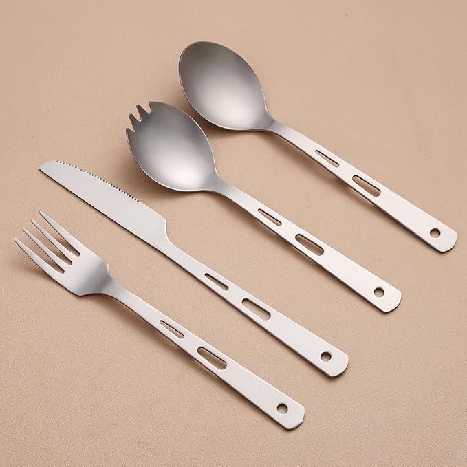 - Healthy, Safe & Eco-Friendly: Crafted from 99.9% pure titanium, this cutlery set is 100% food-grade, non-toxic, and free from harmful coatings or plastics. Titanium is known for its hypoallergenic properties, making it a great choice for those with sensitive skin or allergies. Perfect for eco-conscious adventurers seeking durable, sustainable gear.
