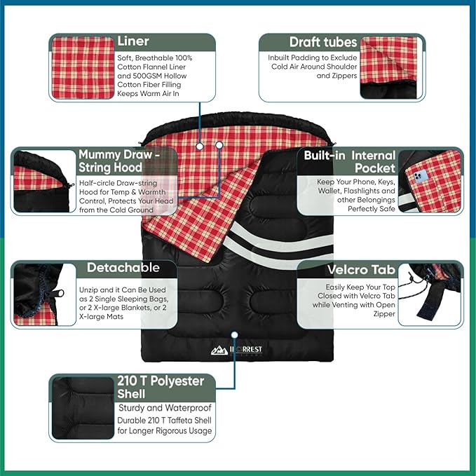 - INNOVATIVE - WIDER & THICKER: IFORREST 10°F double sleeping bag for adults and couples offers extra width and thickness, perfect for winter camping. Features 500 g/m² cotton filling, min temp range 10°-14°F