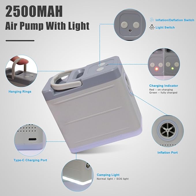 - ใ๐๐ฎ๐ฅ๐ญ๐ข-๐๐ฎ๐ง๐๐ญ๐ข๐จ๐ง๐๐ฅ ๐๐ง๐ญ๐๐ฅ๐ฅ๐ข๐ ๐๐ง๐ญ ๐๐ข๐ซ ๐๐ฎ๐ฆ๐ฉใ-The built-in air pump contains 2*2500mAh high capacity battery, can fill the camping pad in 45S. Pump is rechargeable and detachable. A full charge 3.5 hours can inflate the pad about 7 cycles. The normal light of pump for campsite illumination and the SOS light feature for emergencies. it also has a hook to be attached to the tent. Pls don't run the pump continuously for over 5 mins. Let it cool down before the next use.