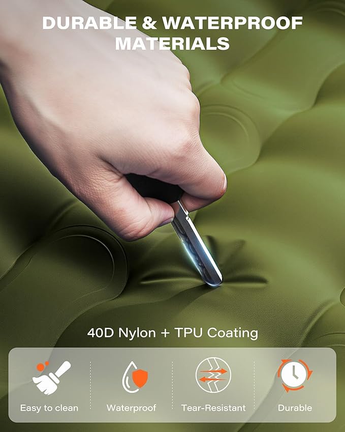 - 【Camping Grade Durable Material】: Camping mattress is built with tough 40D nylon and a TPU coating—tear-resistant, waterproof, and easy to clean. It supports up to 600 lbs, making it perfect for all body types. Heat-sealed edges prevent air leaks, even in rugged outdoor conditions.