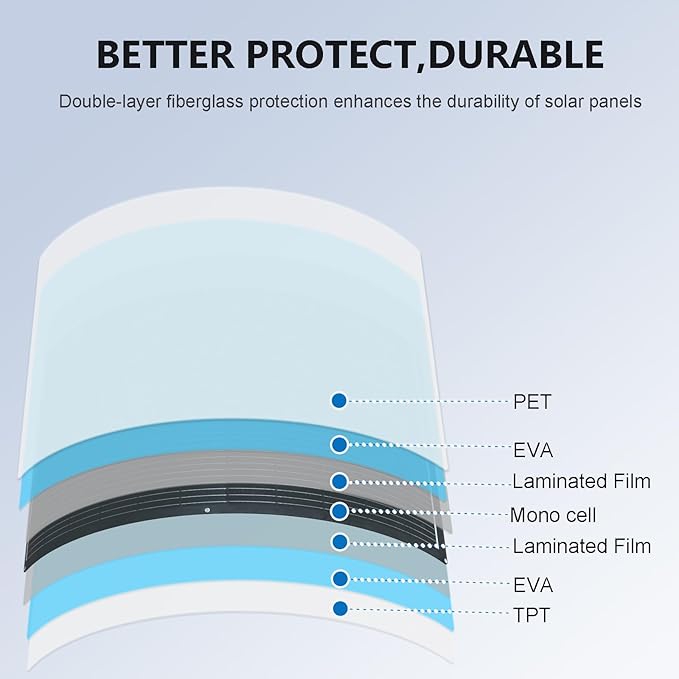 - Exceptional Flexibility and Curved Surface Adaptability.fleixble solar panel bends up to 240°, perfectly conforming to RV roofs, boat curves, or irregular rooftops. Breaks through the limitations of traditional rigid solar panels, unlocking more space potential.