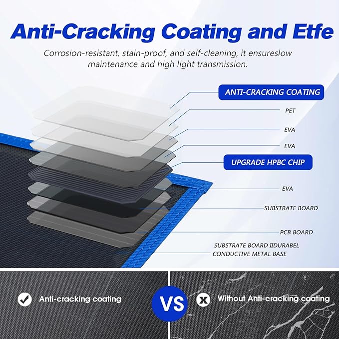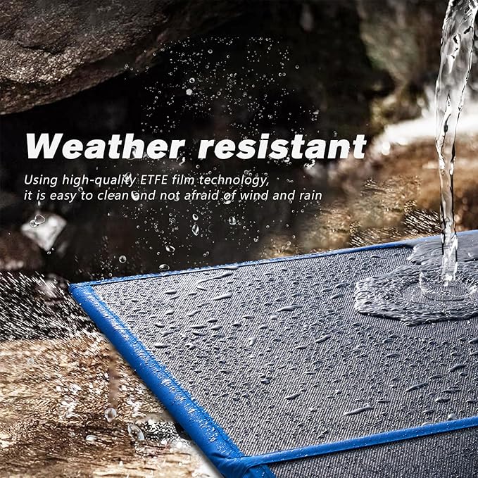 - ☀【Crack-Free Durability】: Portable solar penal the anti-crack, flexible film offers exceptional strength, thermal stability, and resistance to physical stress—protecting the cells from accidental bending, folding, or even stepping. The 12v solar panel tough ETFE construction shields the solar blanket from corrosion and stains, while its self-cleaning, non-stick surface boosts light transmission, ensuring maximum energy efficiency with minimal upkeep.