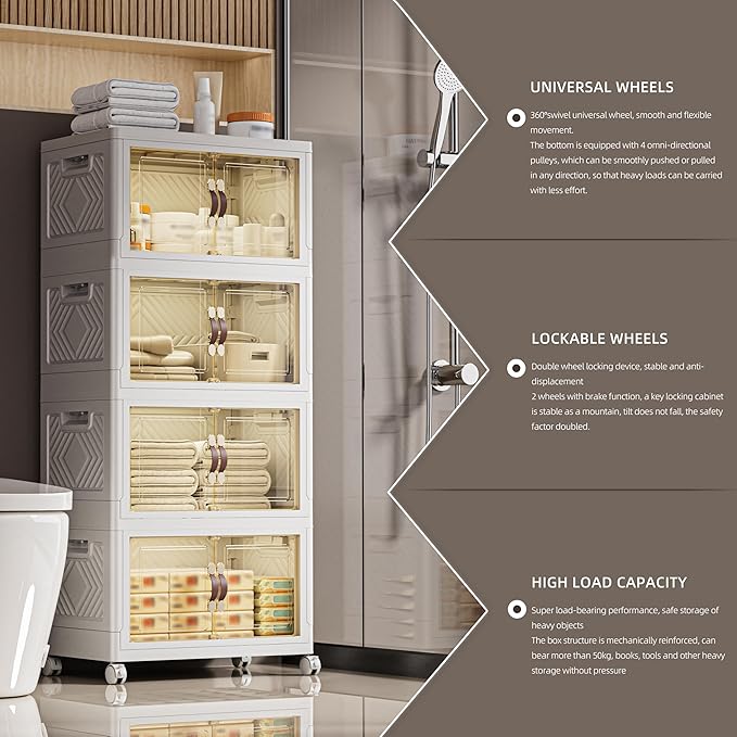 268 QT / 67 Gal White Storage Bins with 1 Lid - Collapsible Stackable Cabinet Organizer w/Wheels & Magnetic Doors, Plastic Storage Box for Office Closet Organization