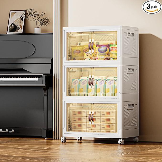 252 QT / 63 Gal Magnetic Door Storage Bins Collapsible Stackable w/1 Lid, Heavy Duty Plastic Cabinet with Wheels for Home Office Organization (White)