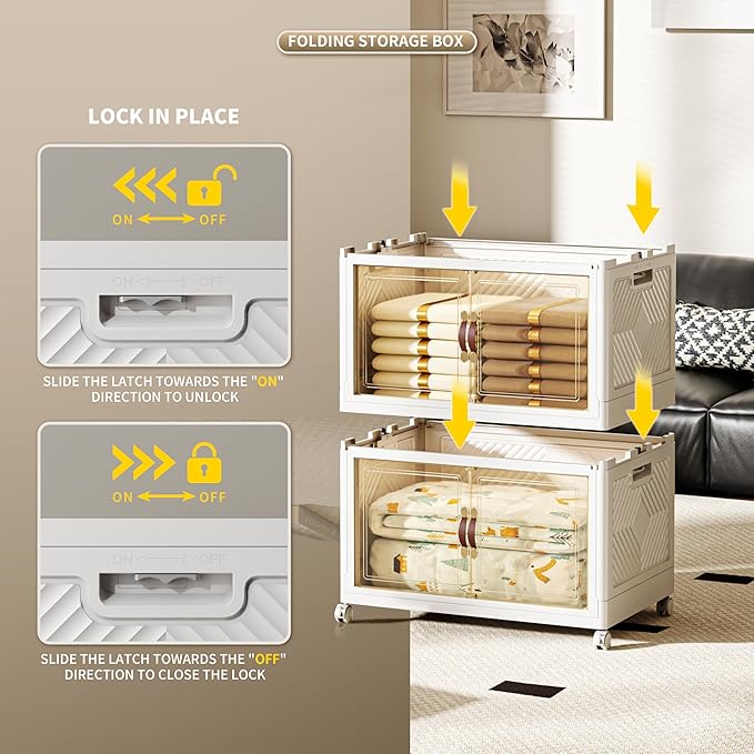268 QT / 67 Gal Collapsible Storage Bins with Wheels & Magnetic Doors - Stackable Plastic Cabinet Organizer for Home, Garage, Closet (White Space-Saving Containers)