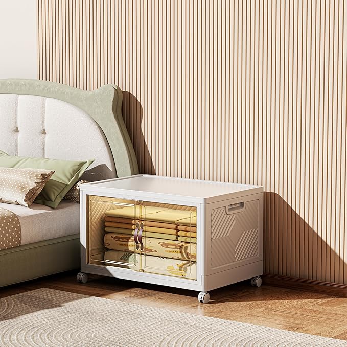 104 QT / 26 Gal Stackable Collapsible Storage Bins with Magnetic Doors & Wheels - Space-Saving Plastic Organizer Cabinet for Closet, Office, Home (White)