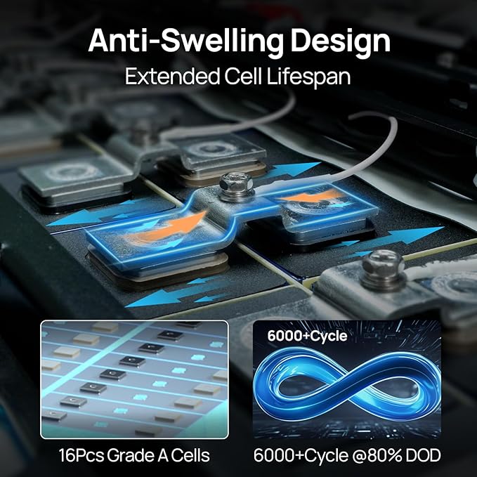 - [Enhanced Safety Design] Designed with safety in mind, our batteries come with a rugged all-metal housing and 100A BMS with multiple protection features. Also, a 125A air switch and battery power switch are integrated for enhanced safety.