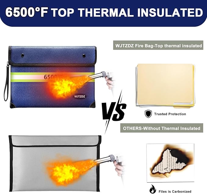 - ⚠️(Note) Fireproof does not mean it can withstand a long fire, and waterproof does not mean it can be immersed in water for a long time.It just gives you enough time to rescue your valuables. 🔥【6500°F Top Fireproof】The upgraded fireproof bag has passed the global flammability standard (US laboratory) and vertical burning test (SGS UL94 V-1) and can withstand temperatures up to 6500°F, far exceeding the typical fire temperature.