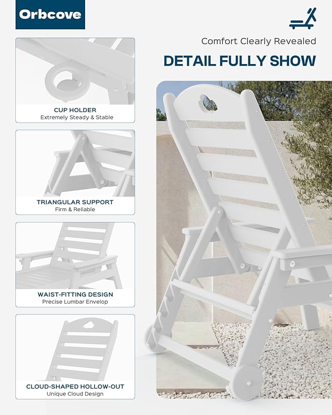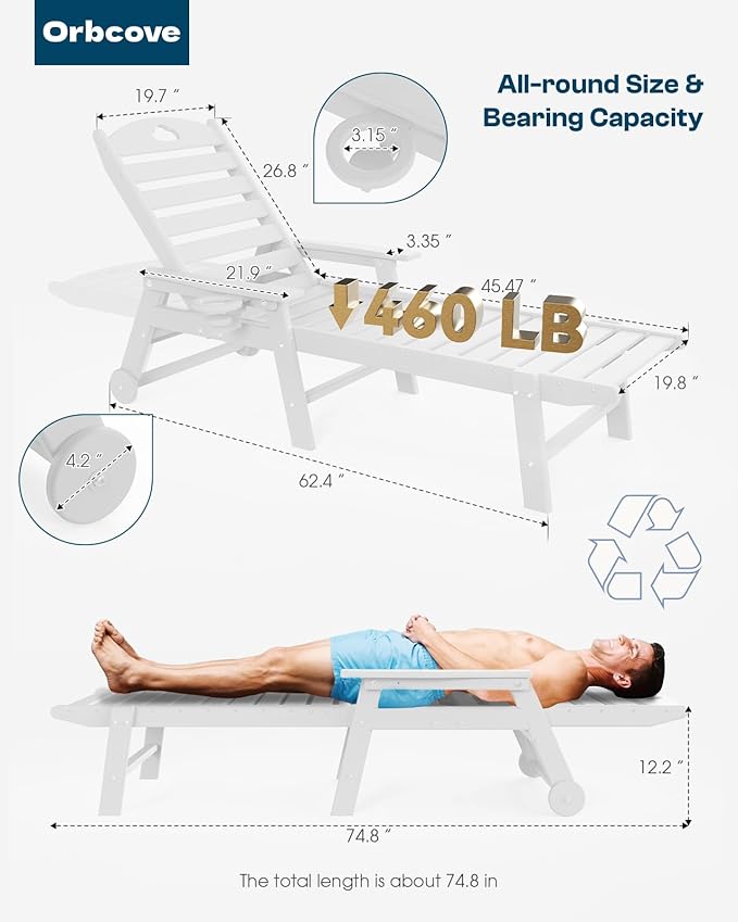- PREMIUM HDPE MATERIAL FOR LONG-LASTING DURABILITY: The Outdoor Lounge Chair Is Crafted From High-Density Polyethylene, Ensuring It won’t Crack, Peel, Or Fade, Even Under Harsh Weather Conditions. Unlike Traditional Wood or Plastic, This Outdoor Chaise Lounge Offers the Elegant Look of Wood with Unmatched Durability, Making It Perfect for Poolside, Patio, Or Backyard Use. Its UV-Resistant Finish Keeps the Color Vibrant for Years, So Your Chair Looks Brand New Season After Season.