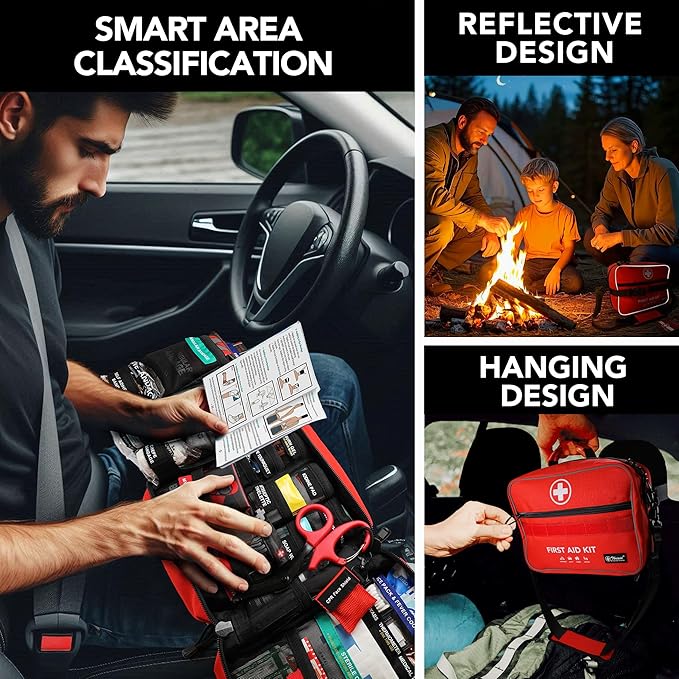 - BORN FOR FIRST AID ▶ Equipped with reflective strips on both sides to reflect light in the dark. The handles on the top, comfortable shoulder straps on both sides and MOLLE system greatly increase portability. Just hang it on backpack, car seat, bicycle or place it in any space. Ideal for home, outdoor, travel, vehicles, offices, etc.