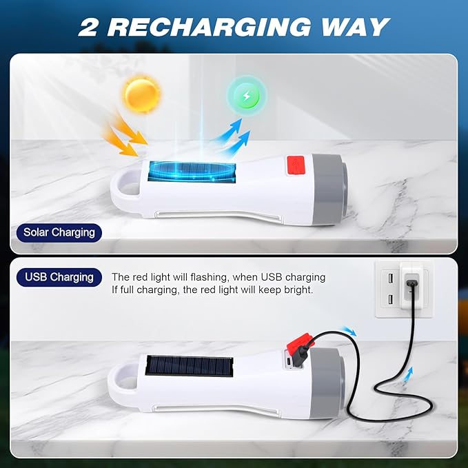 - 2 Kinds of Power Supply Methods: Solar, USB charging to supply power. The red light will flashing, when USB powered. If full charging, the red light will keep bright. Making sure you have light with you at anytime.