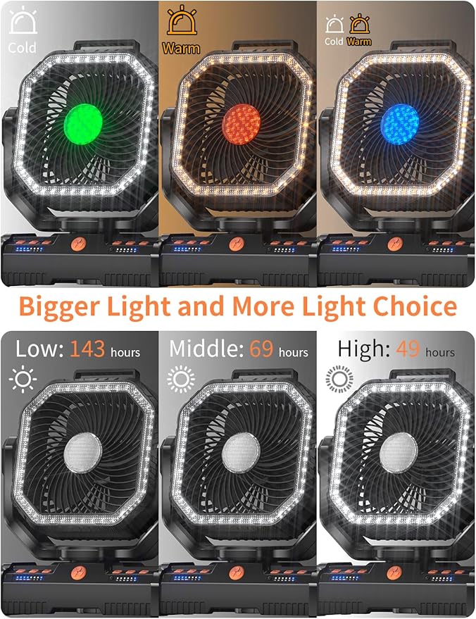- 3 Levels of Brightness & 3 Color Temperature - This camping tent fan with LED latern can light up the enviroment when it's dark. 3 color temperature, warm/cool/warm&cool, provide more choices than other fan to meet your preferences. From low brightness to high brightness, a fully charged battery fan can be used for 143-68-49 hours.