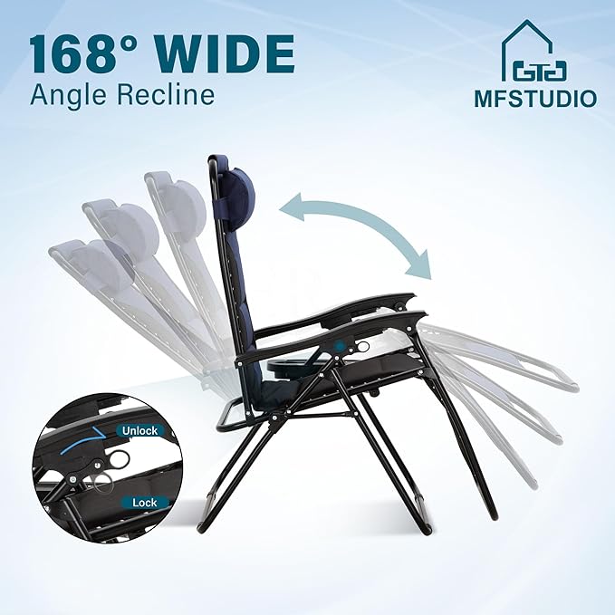 - Effective Reclining System: A locking system makes the reclining chair can be smoothly glided to any reclined positions with 0-168 degrees. Weight-distributing elevation helps alleviate pressure, providing optimal support and a zero-gravity weightless experience. Adjust the lawn chairs into the perfect angle to get a comfortable recline position!