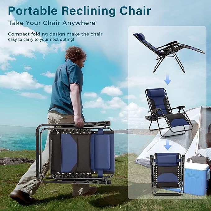 MFSTUDIO Padded Zero Gravity Chair Set of 2, Folding Patio Lounge Recliner with Adjustable Pillows & Cup Holder for Poolside Backyard, Support 400lbs(Navy Blue)