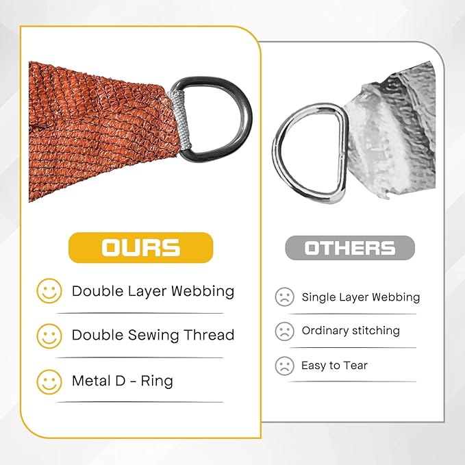 - ?�Sun Shade Sail Material?? Made of 185 GSM UV-protected high density polyethylene(HDPE) shade fabric, features strong stitched seams, durable stainless steel D-rings in each corner for easy attachment, adopts double-sided stitching technology, is tear-resistant. Even with strong sunlight, our sun shade sail can still maintain its original appearance.