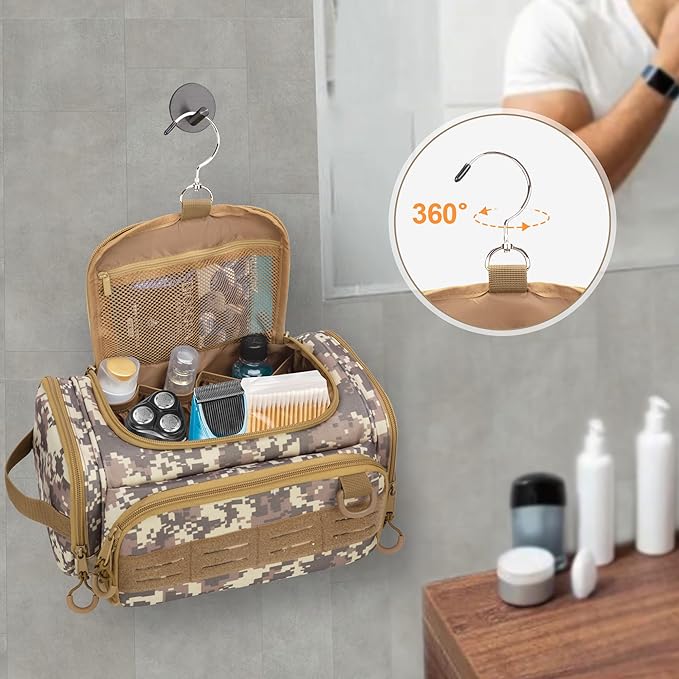 - TOILETRY BAG WITH HOOK: The top flap features a mesh pocket for storing personal items and a 360-degree swivel, non-slip hook that easily hangs on towel racks, coat hooks, or tree branches. This design saves space and provides easy access to toiletries while bathing.