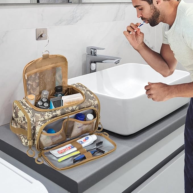 Tactical Toiletry Bag for Men, Hanging Hygiene Bag, Travel Dopp Kit Organizer for Shaving, Shower Essentials and Toiletries, Desert Yellow (Empty Bag)
