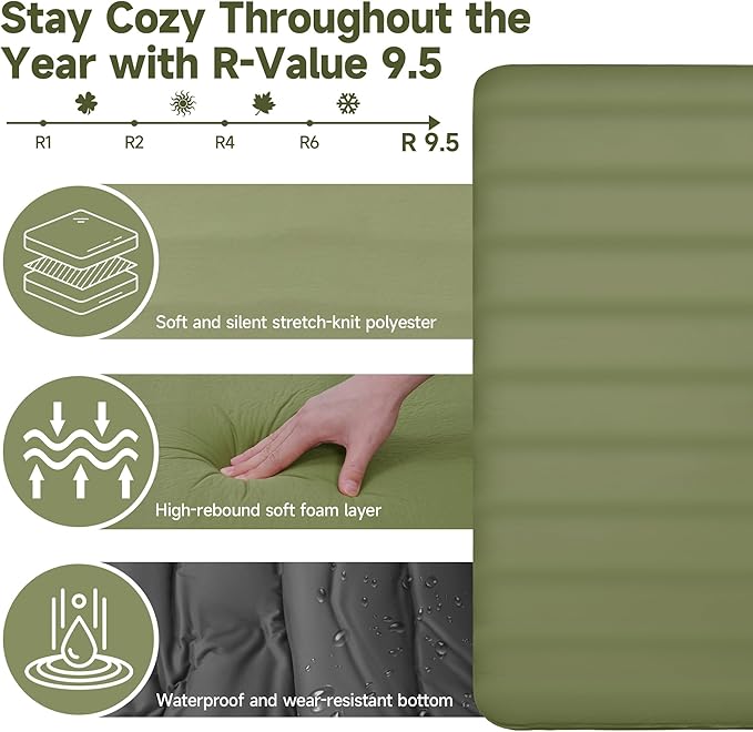 - Suitable for All Season: With an R-Value of 9.5, our air mattress for camping provides excellent insulation for both winter warmth and summer breathability. The foam filling ensures the comfort and insulation in various outdoor adventures. With the durable fabric composite TPU layer, our sleeping mattress is waterproof, suitable for all season, easy to clean