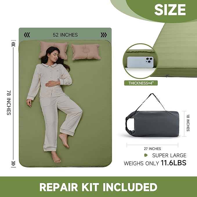 - 4'' Extra Thickness & Spacious for all sizes: The double camping mattress for 2 person is as thick as 4'' once fully inflated, provides good comfort and supporting up to 650 lbs. Our car air mattress with 78"x52" is wide enough for 2 person sleeping on it, also allows you to stretch yourself and let your body truly relax after an exhausting day