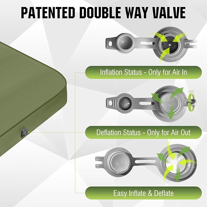 - Easy to Inflate & Deflate: Our self-inflating truck bed mattress comes with the unique double two way valve and makes inflating & deflating a breeze.Just several minutes for it to self inflate and a few bags of air added with the included pump sack, saving your time and effort. Reverse the valve cover and install it to the valve and the valve will stop air from getting back to ensure an easier deflation