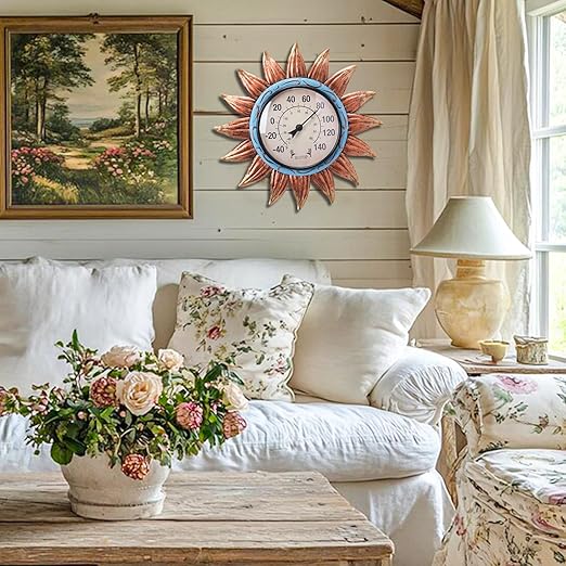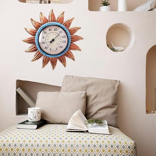 - {Indoor Outdoor Thermometer} The exterior of the indoor outdoor thermometer is designed with the SUNFLOWER pattern, which is both eye-catching and modern; Can be placed indoors or outdoors. To prolong its life span and keep accuracy, do not place it in damp areas outside or direct sunlight