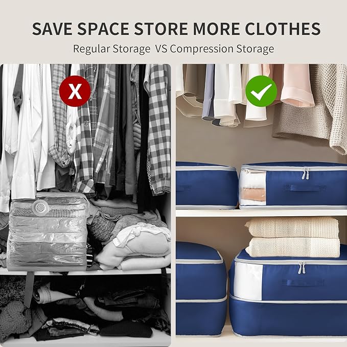 - Innovative Compression Storage Bags:Our compression organizer keeps the air inside during compression, protecting the fibers and down in your clothes and comforters from damage. Save space while ensuring that your items remain fluffy and as good as new when you open them the following year! They can be safely stored in your attic or basement. The dimensions of the compression bags are 11.8 inches (compressed: 5.9) x 16.54 inches x 21.26 inches