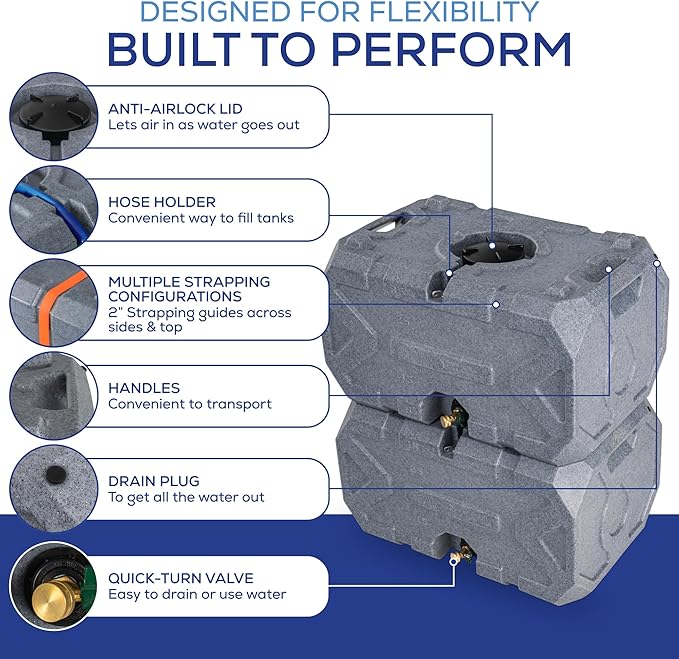 - High Quality Build: Our tanks are made in the USA, and are BPA-free, UV-resistant, NSF, ANSI, and FDA compliant, and can be recycled. We make our tanks with a customized HDPE that has a higher impact strength and higher crack resistance than traditional LDPE, MDPE, and HDPE. This ensures a very safe, strong, and clean water storage solution for any situation.