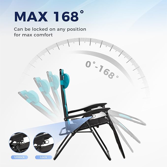 - 【Lockable Reclining System Gravity Chair】: The lock catch is more convenient to operate than twist knobs. Simply pull the clip back to lock and push the clip front to unlock. It can be adjusted at any angle from 0 to 168 degrees, smoothly glides to an ergonomic zero-gravity position